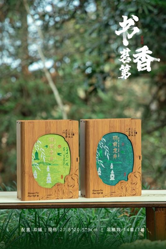 The gold foil "Mingqian Longjing" text and Jiangnan landscape pattern on the box surface echo each other, showing elegant Eastern charm.