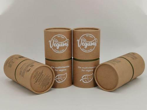 This Vitamin Packaging Paper Canister outside is coated with brown kraft paper and inside is with yellow neck and brown kraft paper liner which is rather eco-friendly,rather suitable for vitamin packaging.