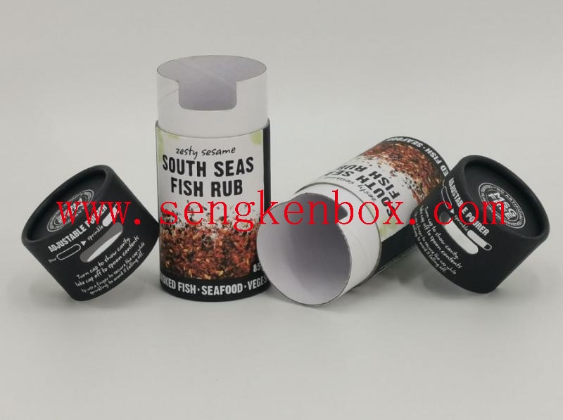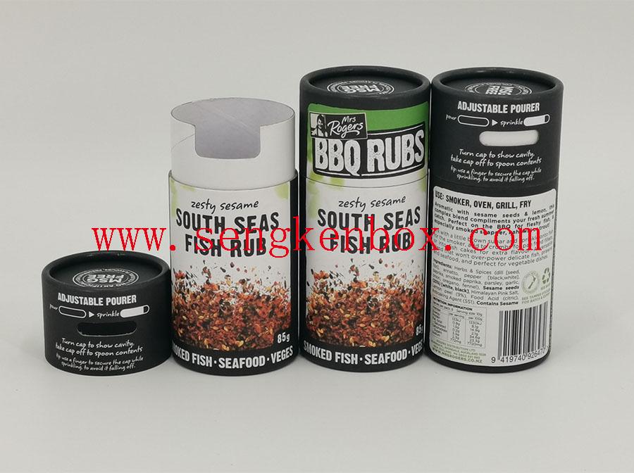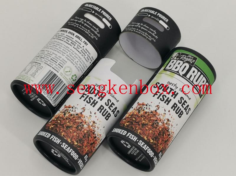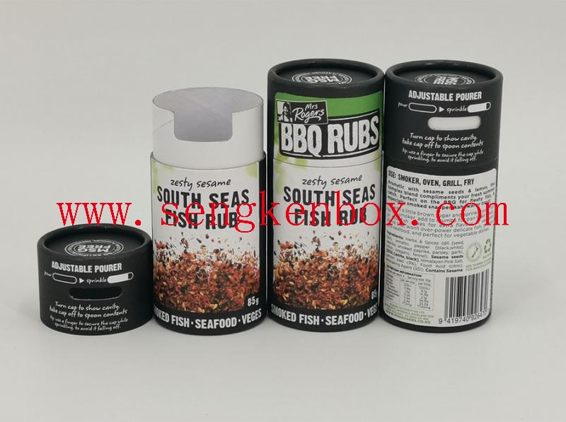 Material: Middle Kraft Paper Core+Inner Coated AL Foil Liner+Rigid Grey Cardboard+Outside 157g White Kraft Paper with Printing logo+Glossy Varnishing+Plastic Shaker Lid for the Barbecue Seasonings Packaging Canister