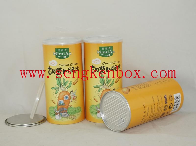 This Carrot Crisps Food Packaging Paper Cans is for packing seeds,It is a composite food grade canister with moisture-proof aluminum foil liner.