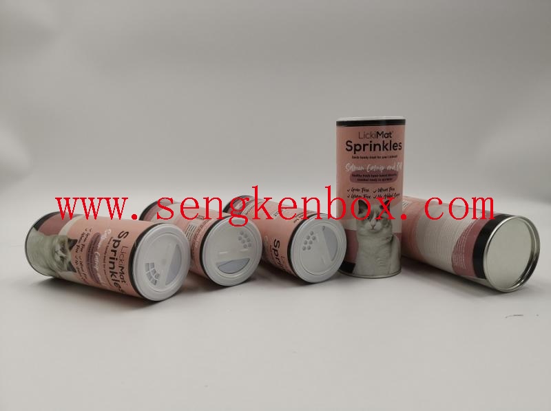 This Shaker Paper Cans is for packing Cat Food Biscuit,It is a composite food grade paper canister with grease-proof aluminum foil liner.