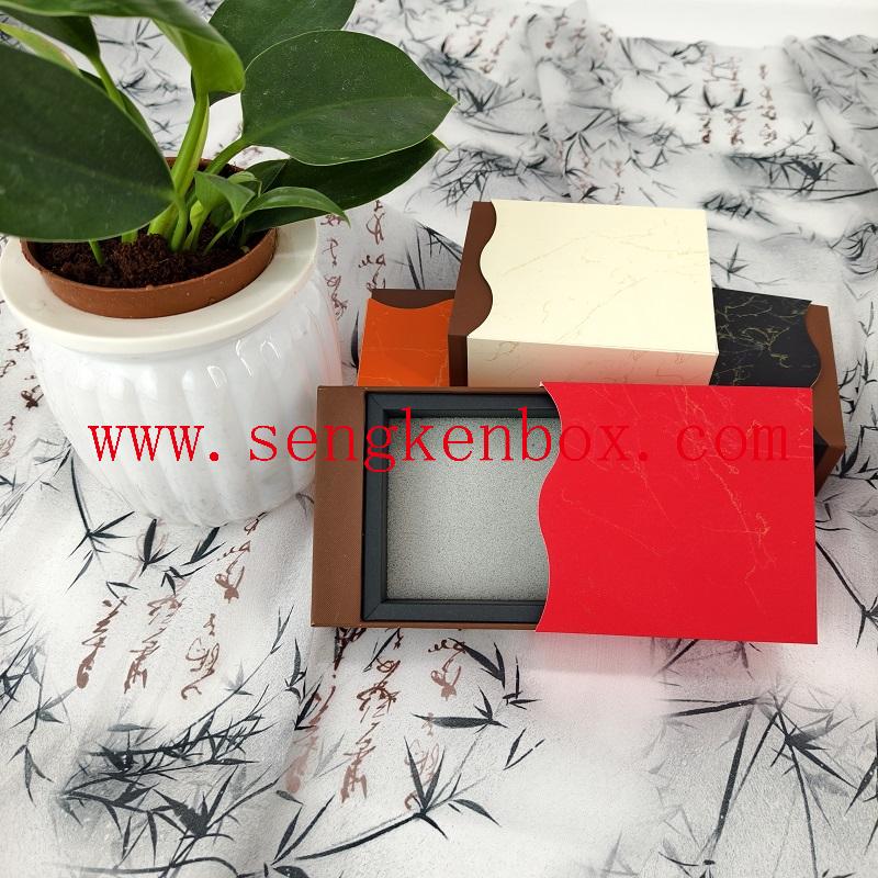 This contrast color texture small gift box is made of specialty paper and hard cardboard, with a unique wave covercombined with marble texture craft for rich visual layers. Muttiple color contrasts such as red-brown and orange-brown areavailable, and the built-in sponge lining can protect small items such as tea,aromatherapy and jewelry.It supports log0and size customization, making it an excellent choice for souvenir and small gift packaging.