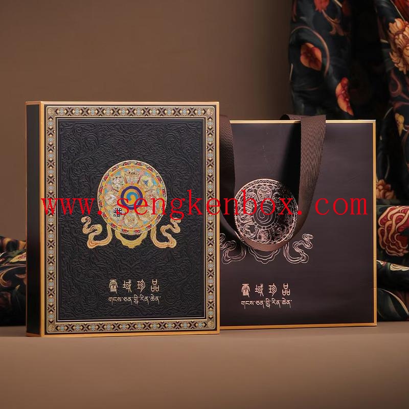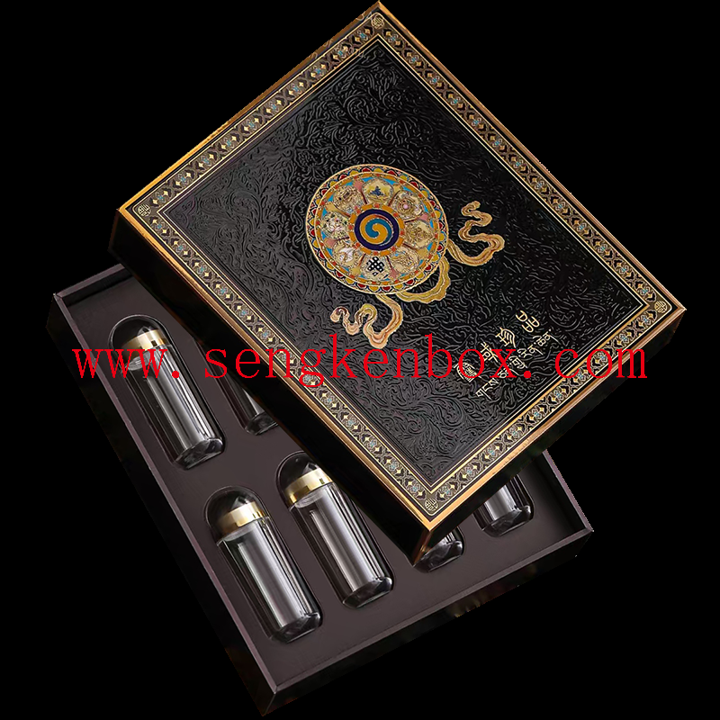 This is our high-end Chinese-Tibetan style empty gift box set named "Snowland Treasure", equipped with 8 independent portable sealed sub-packaging bottles.