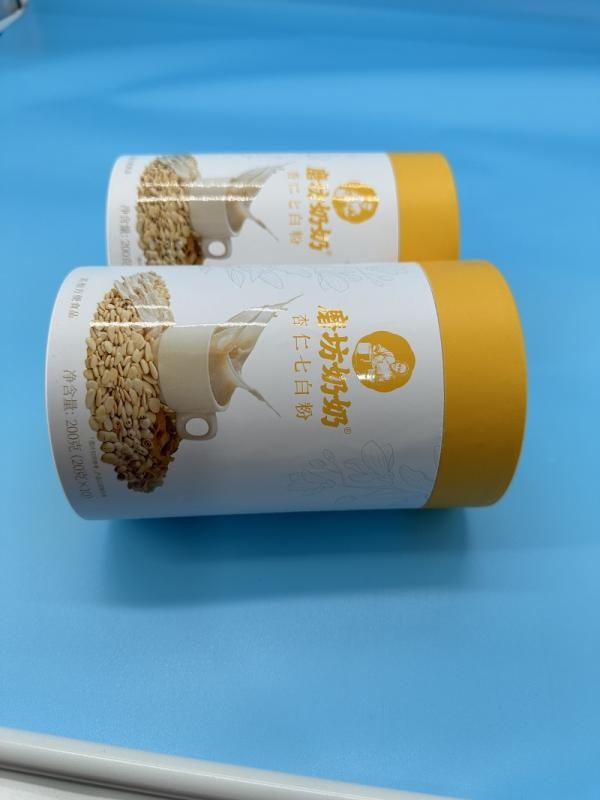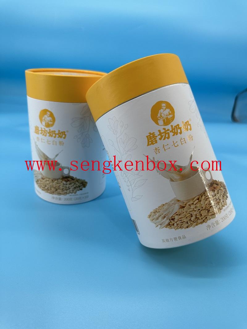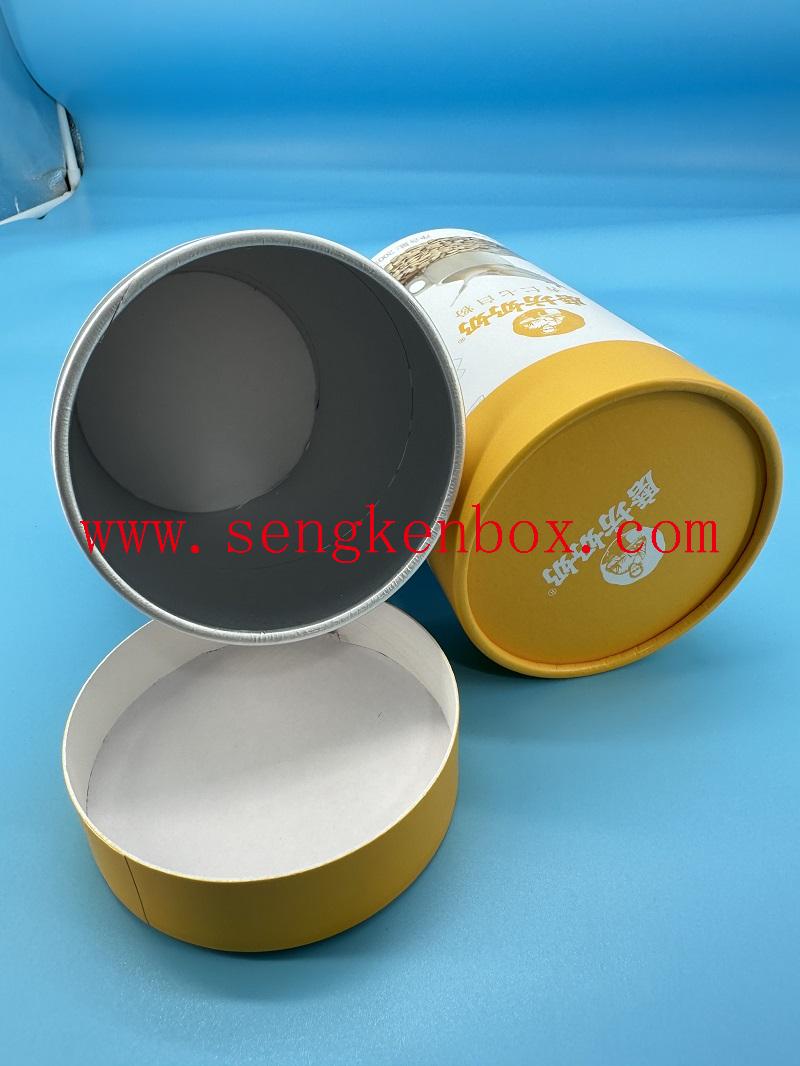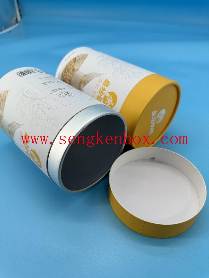 Material: Middle Kraft Paper Core+Inner Coated AL Foil Liner+Rigid Grey Cardboard+Outside 157g White Kraft Paper with Printing logo+Glossy Varnishing for the paper food grade canister