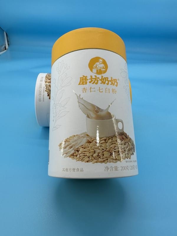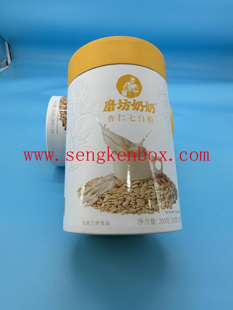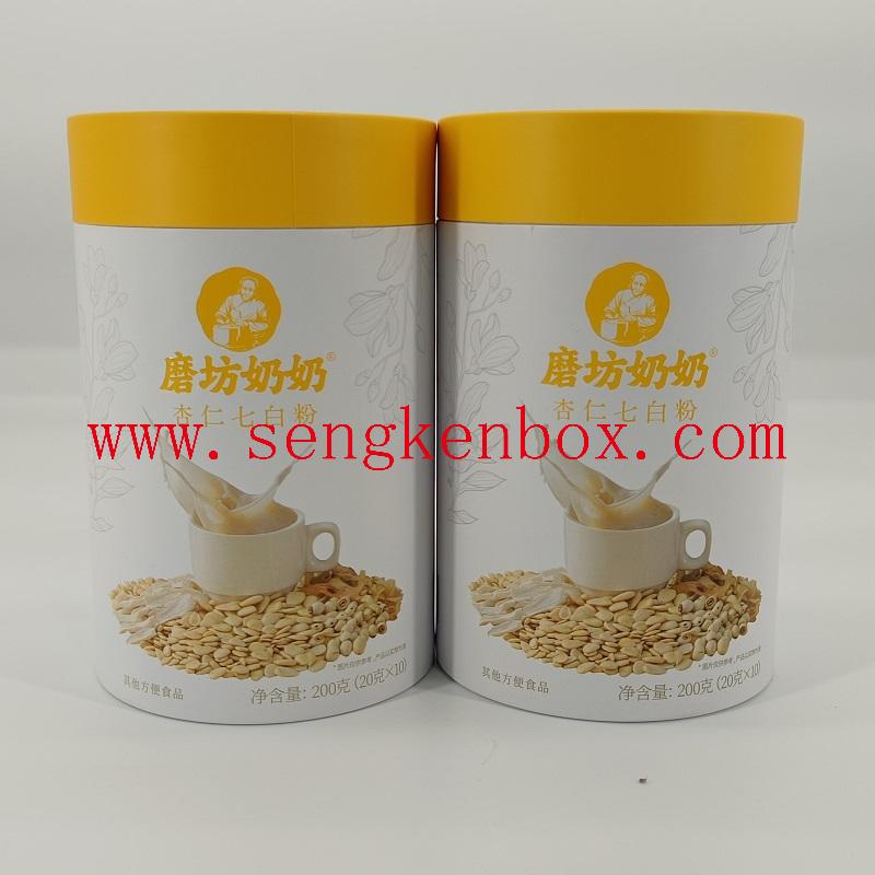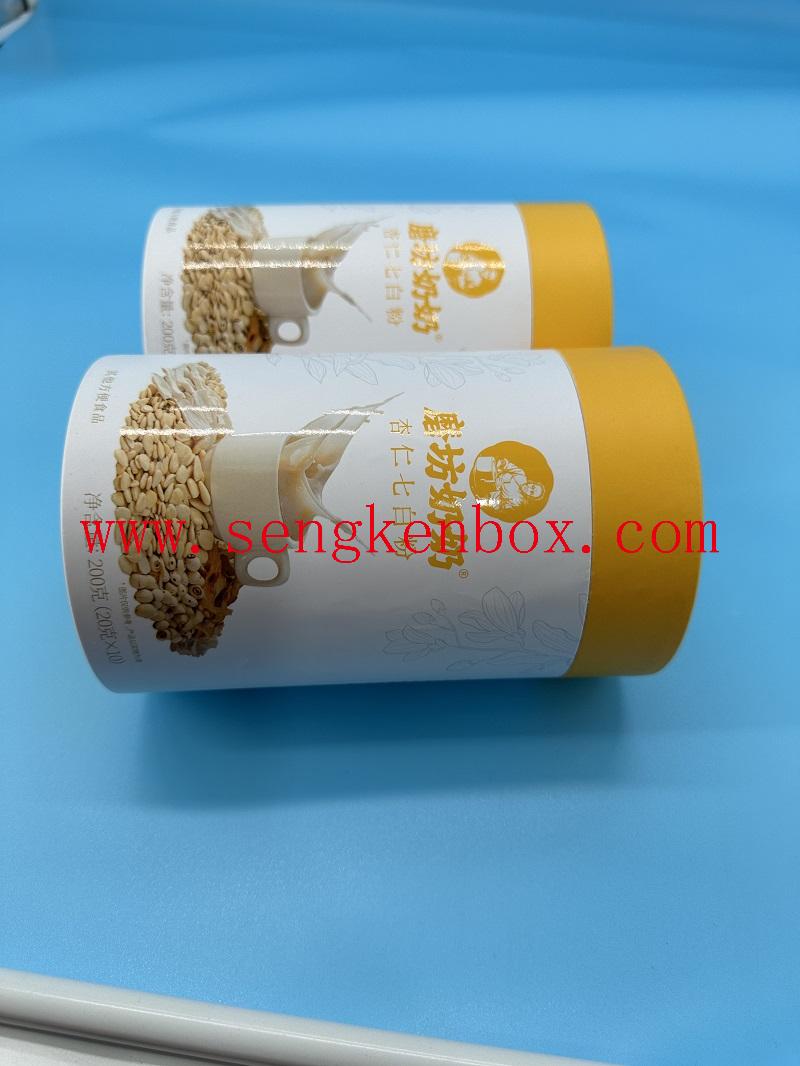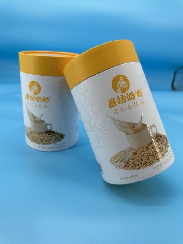 Material: Middle Kraft Paper Core+Inner Coated AL Foil Liner+Rigid Grey Cardboard+Outside 157g White Kraft Paper with Printing logo+Glossy Varnishing for the paper food grade canister