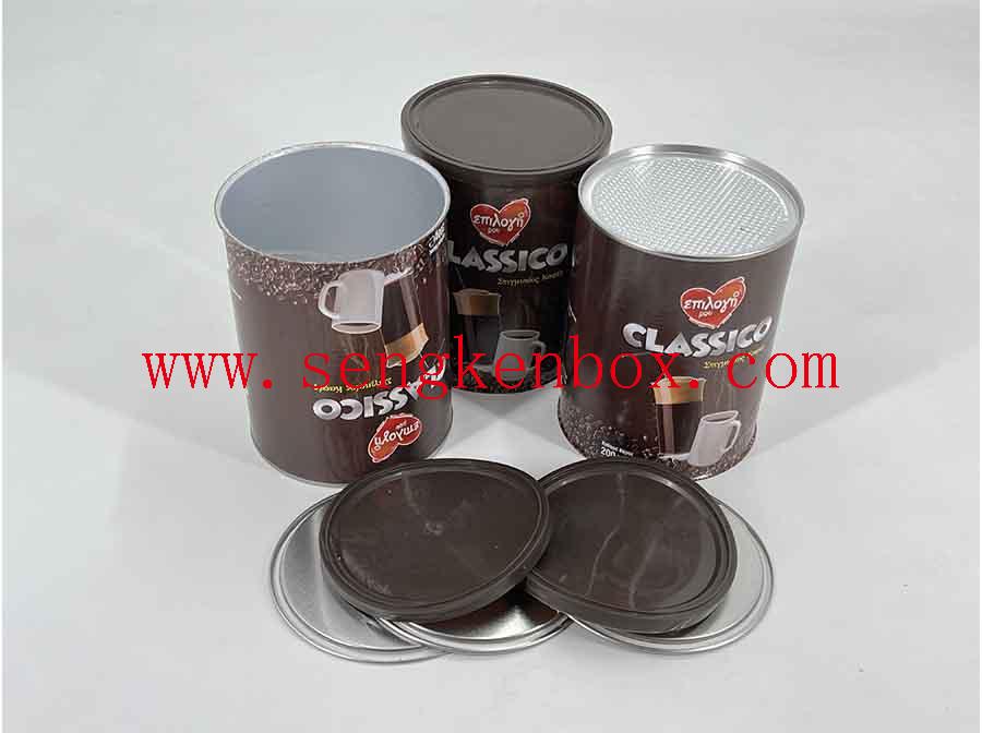 Material: Middle Kraft Paper Core+Inner Coated AL Foil Liner+Outside 157g White Kraft Paper with Printing logo+Glossy Varnishing+Tinplate Ring Aluminum Foil Easy Peel Off Lids for the Customizable Outer Packing Simple Coffee Food Cans