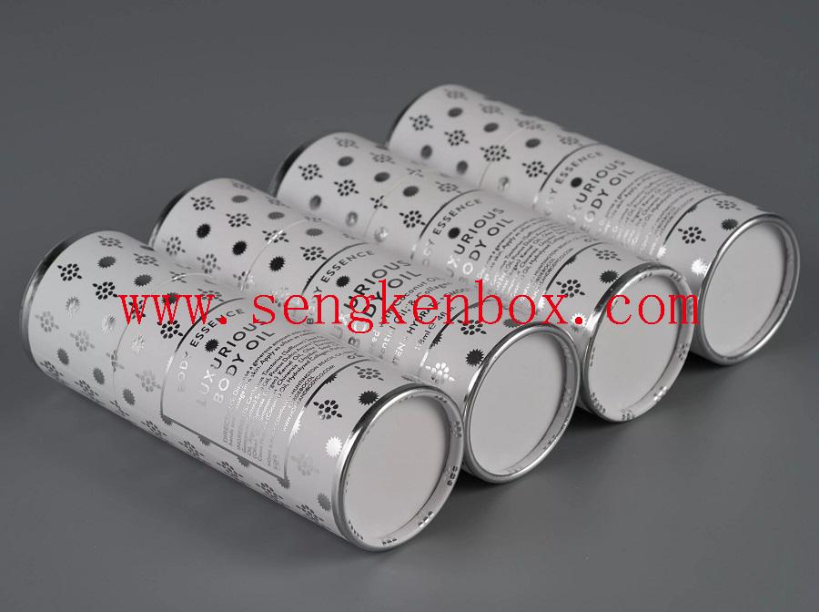 This Body Essence Oil Packaging Paper Tube outside is coated with silver card printing paper and inside is with food grade ivory board which is rather eco-friendly,rather suitable for Body Essence Oil packaging.