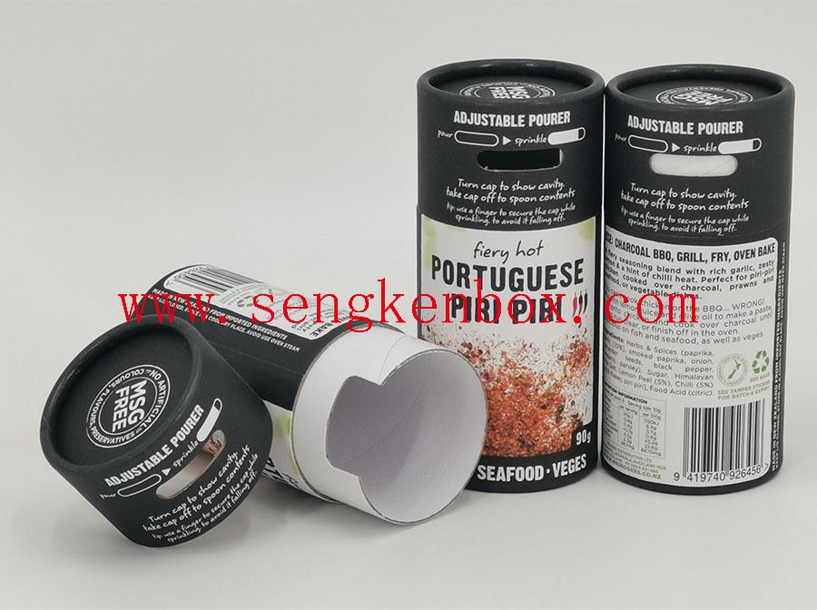 Material: Middle Kraft Paper Core+Inner Coated AL Foil Liner+Rigid Grey Cardboard+Outside 157g White Kraft Paper with Printing logo+Glossy Varnishing+Plastic Shaker Lid for the Barbecue Seasonings Packaging Canister