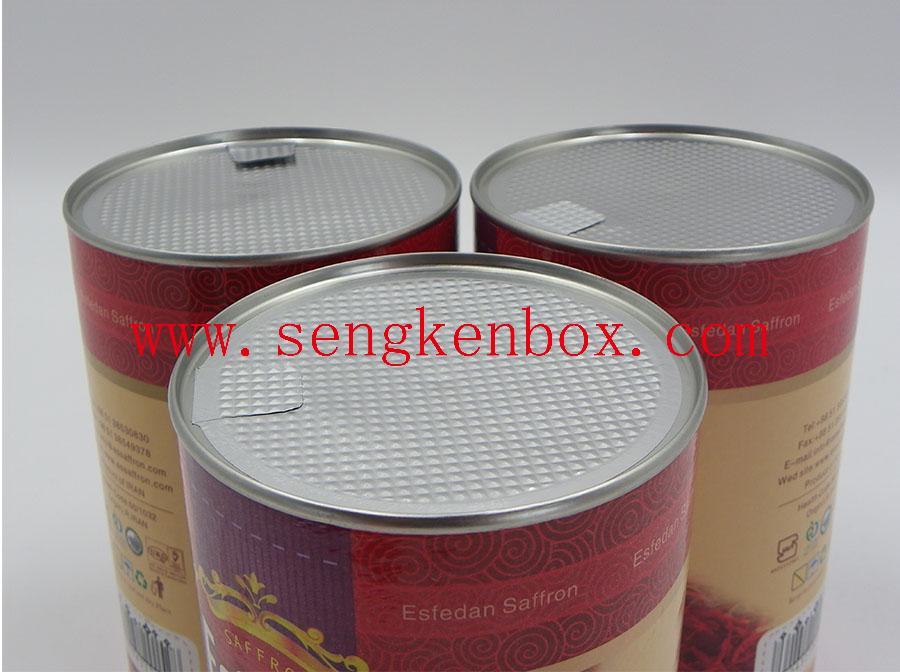 Material: Middle Kraft Paper Core+Inner Coated AL Foil Liner+Outside 157g White Kraft Paper with Printing logo+Glossy Varnishing+Tinplate Ring Aluminum Foil Easy Peel Off Lids for the Esfedan Saffron Packaging Paper Cans