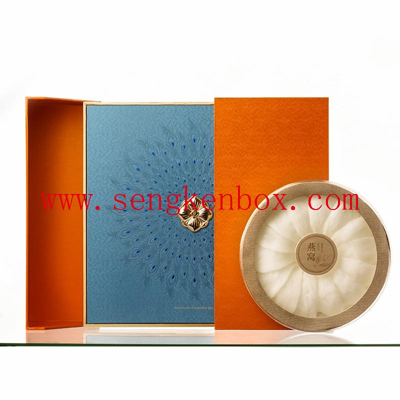 This luxury Chinese-style tonic gift box takes auspicious peacock spreading its tail as design inspiration, matched with delicate metal flower buckle and gradient hot stamping emboss craft, showing classic oriental aesthetic charm.