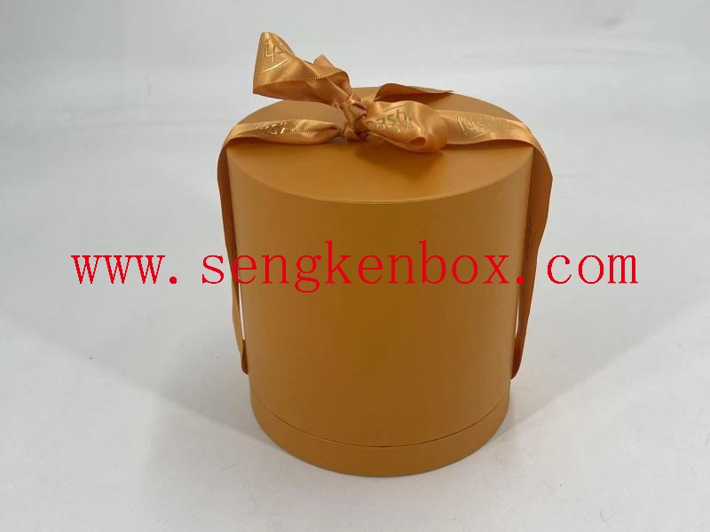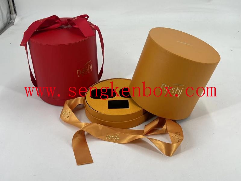 This Round Gift Box with Silk Ribbon Cosmetic Products Boxes with Gold Stamping and EVA liner outside is coated with art paper and inside is white paper liner which is rather eco-friendly,rather suitable for Ornament packaging.It is with Leather Handle, easy to take.