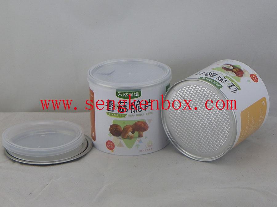 Material: Middle Kraft Paper Core+Inner Coated AL Foil Liner+Outside 157g White Kraft Paper with Printing logo+Glossy Varnishing+Tinplate Ring Aluminum Foil Easy Peel Off Lids for the Mushroom Crisp Food Grade Packaging Paper Cans