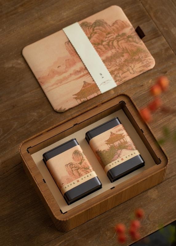 Square Antique Wooden Box with Leather Cover Traditional Pattern with Two Tin Cans Portable High-end Gift Box