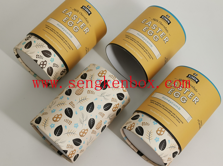 Material: Middle Kraft Paper Core+Inner Coated AL Foil Liner+Rigid Grey Cardboard+Outside 157g White Kraft Paper with Printing logo+Glossy Varnishing for the Two Pieces Food Grade Paper Chocolate Packaging Round Cans Box