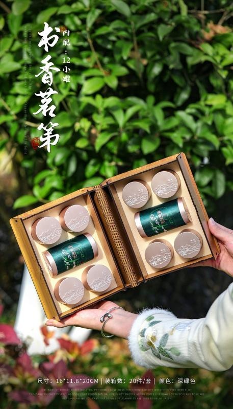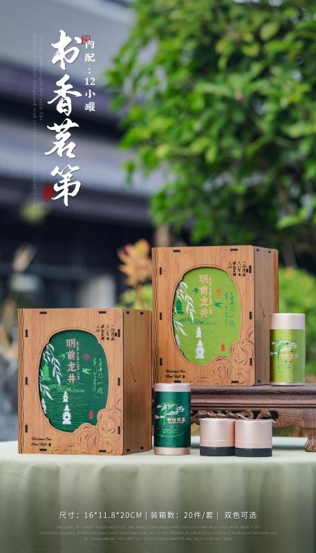 Introducing our Premium Leather-Wrapped Tea Gift Set—a masterpiece of design and functionality crafted for those who appreciate the art of tea and the power of presentation.The double-layer sealed lid with a breathable valve design not only locks in the freshness of tea, nuts and other ingredients, but also expels excess moisture for better moisture-proof and anti-oxidation effects. The can body supports logo customization via laser printing or stickers, making it highly suitable for tea shops, food brands, or as gift packaging. It is a cost-effective choice to enhance product quality.This "Shuxiang Mingdi" tea gift box features a bamboo-patterned wooden body with a Chinese-style hollow window design. The gold foil "Mingqian Longjing" text and Jiangnan landscape pattern on the box surface echo each other, showing elegant Eastern charm. The gift box adopts a double-layer wooden structure, with 12 sealed small cans (including 2 large cans + 10 small cans) inside, which is moisture-proof and fresh-keeping, suitable for green tea, black tea, white tea and other types of tea. The matching tote bag also adopts a Chinese-style design, with an overall high-end texture, suitable as a business gift or holiday tea gift. It supports bulk custom LOGO and patterns to meet branding needs.