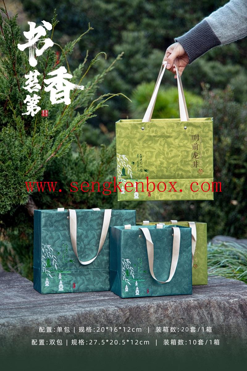 The gold foil "Mingqian Longjing" text and Jiangnan landscape pattern on the box surface echo each other, showing elegant Eastern charm. The gift box is available in single-pack and double-pack specifications, with shockproof lining and tea pack positions wrapped in red ribbons, which are moisture-proof and fresh-keeping, suitable for green tea, black tea, white tea and other types of tea. The matching Chinese-style tote bag has a high-end texture, suitable as a business gift or holiday tea gift. It supports bulk custom LOGO and patterns to meet branding needs.